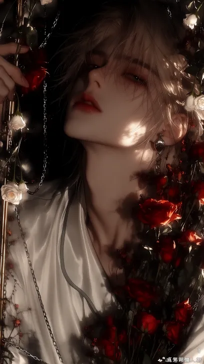 Midjourney Bot 更新时间:2026-02-04 00:37超级细半厚涂画风,一个男性纤细少年,上半身特写,近景,他身穿白色丝绸睡衣,有灰色边,在爬满带刺红玫瑰藤蔓的黄金笼中瘫坐,双手抓笼杆,表情忧郁,白色长发,看镜头超清晰面部,他白色长发柔顺,根根分明,睫毛纤长根根分明,表情忧郁,场景中灰白雾气浓密,地上散落大量枯萎玫瑰花朵,空中飘着较多白玫瑰花朵,周围缠绕银黑锁链,整体氛围昏暗诡异,丁达尔效应明显,优化色彩层次,自然光线,质感十足,摄影风格,比例9:16。半厚涂画风,cg感觉。 --ar 9:16 --c 17 --weird 187 --stylize 764 --niji 7 --sref https://images.gogpt.vip/aigf/m_origin/20260204/2034231/k0vb071am1di7aij.jpg --sw 1000 --no 低分辨率
