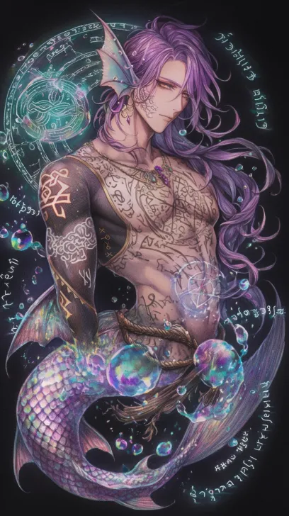 Midjourney Bot 更新时间:2026-02-04 00:38彩色铅笔插画,水彩插画,紫发俊美动漫鲛人男人,耳鳍,鳞片,大大的鱼尾,五彩斑斓的发光粒子,发光的泡泡,悬浮的魔法阵,符文tattoo cook,梵文,诅咒文字,精致画风,黑色背景,清晰的轮廓和线条 --ar 9:16 --style raw --stylize 180 --niji 6 --no no