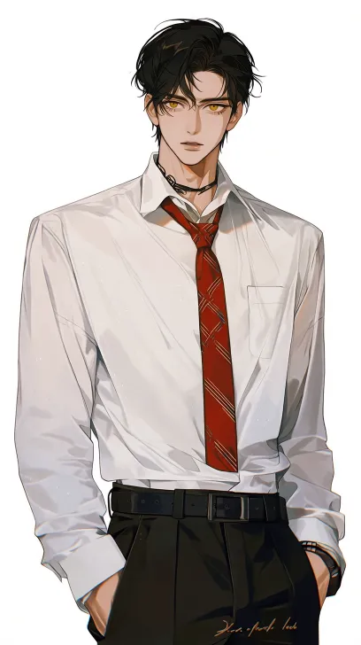 Midjourney Bot 更新时间:2026-02-04 00:38男性,黑色日系dk制服,白色衬衫,红色领带,黑色粗边眼眶 --ar 9:16 --stylize 100 --niji 7 --no 长发、幼年脸