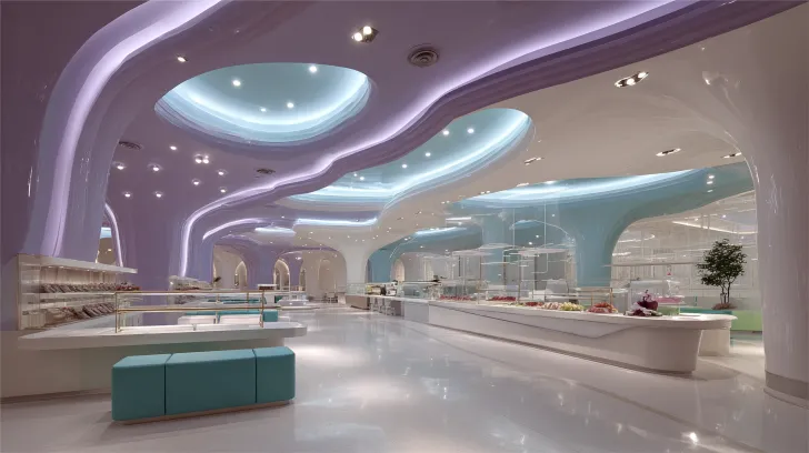 Midjourney Bot 更新时间:2026-02-04 00:39梦核美学餐厅。模仿电影大师库布里克风格,模仿电影《神奇四侠》。太空时代科幻氛围。自然青色烟雨主题,超大长条形室内空间,模块化餐区,服务台,自助窗口,模块化造型柱子星河元素,童趣卡座。造型吊顶,发光灯膜。白色为主,淡蓝紫色配色,淡粉色配色,瓷砖,亮面,银质 --ar 16:9 --v 7 --style raw --stylize 100
