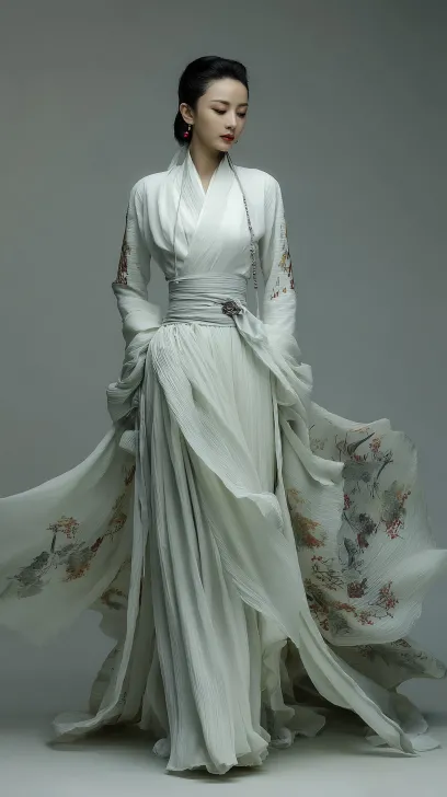 Midjourney Bot 更新时间:2026-02-05 00:00一件月白色真丝绡与宋锦交织的长裙,采用交领右衽松身剪裁,腰间垂落一片改良蔽膝——其形如不对称的层叠云纱片,以靛青与金线绣出简化翟鸟纹,边缘散缀细小红宝石如晨露。袖口窄而微喇,裙长及踝,侧开衩方便行步,领口略敞露出锁骨以上,无束腰亦无繁复裙摆。外搭一件半透的竹青灰欧根纱长背心,以玉环扣在肩侧,衣摆随风轻扬。整体清逸如宋画中的烟霭,行动间轻盈若无物。 --ar 9:16 --v 7 --style raw --stylize 160