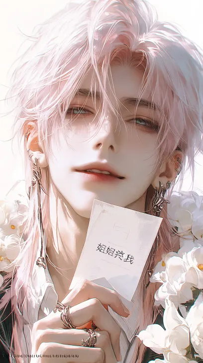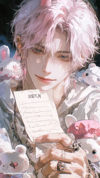 Midjourney Bot 更新时间:2026-02-05 00:00年轻男子,飘逸蓬松凌乱粉白渐变色卷毛,头发被打上光,有细节描写 手饰,耳饰,白色毛衣,长相可爱 黑色瞳孔,眼神无光,迷离,皮肤白皙, 富有性张力,眼睛微眯清冷感,娇气感,贵气感,神情淡漠,模糊感勾起唇角 正面,带着粉色厨师帽,双手拿着一张纸扯开上面写着四个字黑色字体“姐姐疼我”正对着,卖萌 近距离,背景为在一群白色玩偶的窝里,动作自然懒散 脸部有着细节描写,水润唇,高级CG,bjd质感,磨砂质感,超高清画质,柔光,伪厚涂画风,氛围感灯 --ar 9:16 --stylize 1000 --niji 7