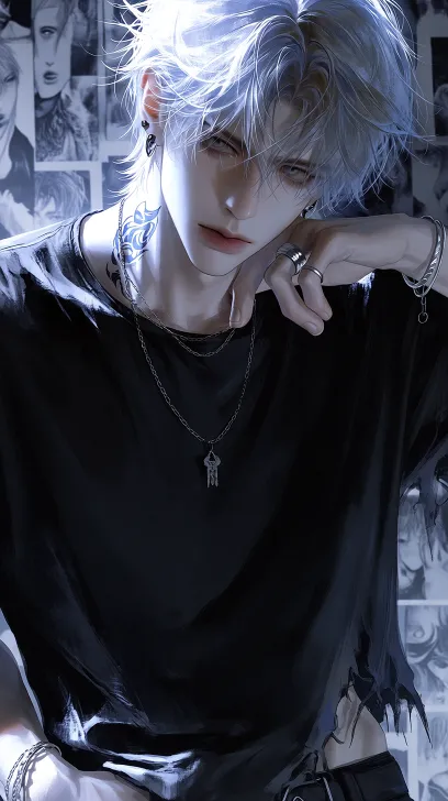 Midjourney Bot 更新时间:2026-02-05 00:01油画,伪厚涂,画质清晰通透,干净,8k分辨率,一个年轻男性,皮肤白皙。立体打光。 白色和浅蓝色挑染的蓬松短发,发丝凌乱,头发边缘亮度增加。 黑色修身短款上衣(衣摆有斜条状破洞),脖子上有纹身。 浅色瞳孔,眼神阴鸷、高傲。 戴耳饰和戒指,戴银色手链,戴朋克风项链,角色正对着镜头,微微仰起头,一手插裤兜,一手抹脖子。 五官立体深邃。狂妄感,不屑感,年少轻狂,痞帅感。上半身照。背景为黑白动漫照片墙。自然光影。 --ar 9:16 --stylize 771 --niji 7
