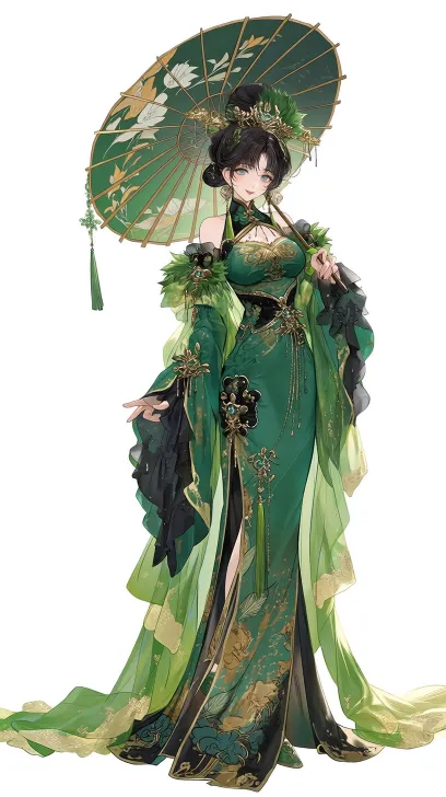 Midjourney Bot 更新时间:2026-02-05 00:01参考清水荣一、山下育人等设计师的设计风格,NIKKE的画风,女性角色,成熟女性,中国古装玄幻,绿色系服装配色,单人站姿立绘,全身,青楼,花魁, --ar 9:16 --stylize 100 --niji 7