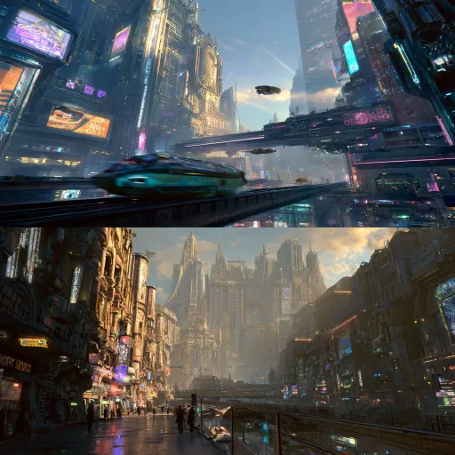 Midjourney Bot 更新时间:2026-02-05 00:01**左侧:** 是充满未来感的赛博朋克都市。高耸入云的玻璃幕墙摩天大楼,楼体覆盖着巨大的全息广告牌和霓虹灯。多层立体交通网络上,流线型的悬浮列车和高空飞车急速穿梭。空中点缀着飞行器和无人机。色调以蓝紫、品红等冷色为主。 **右侧:** 是庄严古朴的中世纪哥特式建筑群。巨大的石造教堂、尖塔、拱券和彩绘玻璃窗清晰可见。建筑上布满浮雕和宗教雕像,街道上有身着长袍的行人。色调以暖金色、暗褐色和石灰色为主。 **关键构图与风格:** 画面采用超广角镜头,强烈的景深对比。一条明显的分界线(可以是道路或光影)将两种文明风格分割开来。光线从左边的冷色霓虹光渐变到右边的暖色夕阳或烛光。画风为高度详细、逼真的数字绘画,具有惊人的细节、动态光影和氛围感,类似顶级概念艺术。 --ar 1:1 --v 7 --stylize 100