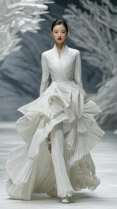 Midjourney Bot 更新时间:2026-02-05 00:03一件月白松身宋风交领长裙,完全摒弃束腰设计,采用多层真丝绡与软缎通过高温压褶工艺形成如雕塑般利落而轻盈的层叠褶皱,自肩颈流畅垂落至脚踝,褶皱走向似山水画中的叠嶂线条。改良蔽膝化为左腰侧一片黛青压褶垂纱,褶痕间嵌入金丝与细小红宝石。外搭一件同色压褶纱质长比甲,以玉环松系于肩。整体如披云雾而行,褶皱是结构而非堆砌,软料却撑起清瘦风骨。 --ar 9:16 --v 7 --style raw --stylize 150