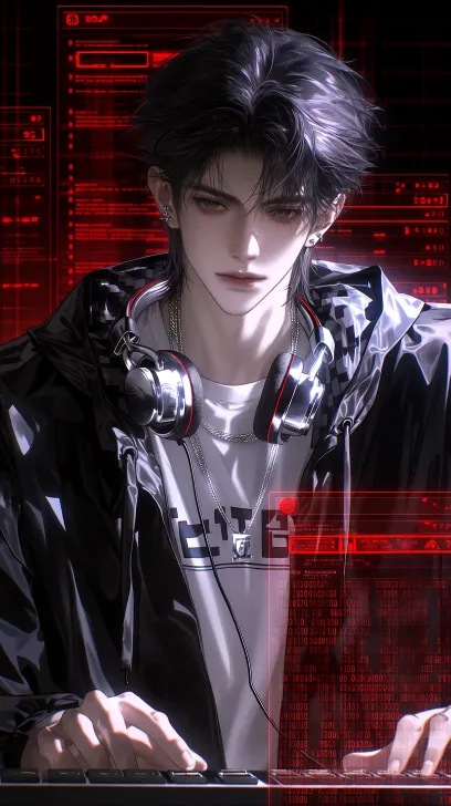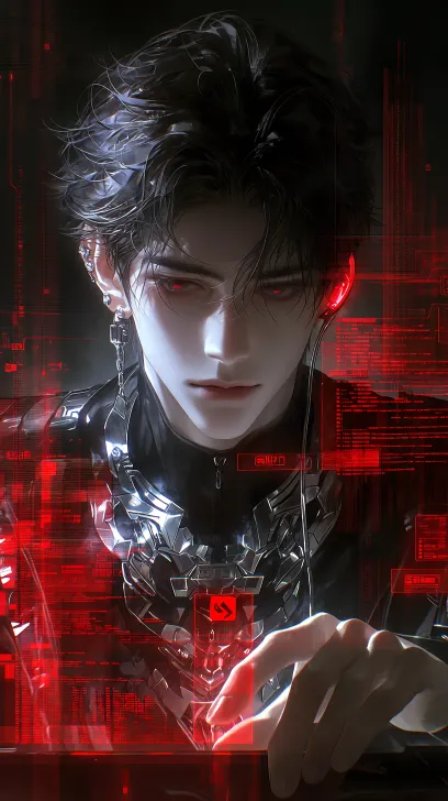 Midjourney Bot 更新时间:2026-02-05 00:09男子,飘逸蓬松凌乱黑发,哑光 耳朵佩戴银色小巧耳钉,带银色富有设计感项链,长相痞帅 五官立体深邃,黑红色眼睛,竖瞳,五官深邃,立体,皮肤白皙 疯批感,病娇感,冷漠感,不屑一顾感,桀骜不驯感,痞帅感,眼神淡漠,没什么情绪起伏 近距离,平视角 正面,背景为发光红色电子浮窗,透明浮窗,上面有着许多代码,衣服为黑色高级特工制服(有些许自然褶皱)阴影描写 戴电竞耳机,耳机周围围着一圈红,单手伸向屏幕,周围有着红色的漂浮电子透明选项窗口,形状有大有小,上面有着密密麻麻的英文字母,面前有着危险警告红色图标,另一只手伸向屏幕触碰电子浮窗 光感强,颜色饱满,磨砂质感 脸部有着细节描写,水润唇,高级CG,超高清画质,冷色调, --ar 9:16 --stylize 764 --niji 7