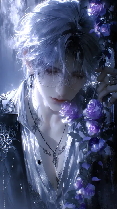 Midjourney Bot 更新时间:2026-02-05 00:03英俊的男人,纯黑色釉面纹理瞳孔,湿润的嘴唇高光,柔顺的头发,邪恶的眼睛带着轻微的轻蔑,阴险的外表,微微低着头,厌世的脸,皮肤BJD纹理冷白,半身照片,银灰色头发,凌乱的微分破盖,凌乱的刘海挡住眼睛,精细的闪光,高端银白色丝绸衬衫,宽松的领口,褶皱,锁骨,耳钉,眉骨指甲,纹身,黑色项链,哑光皮肤冷白,皮肤白接近透明,impasto CG风格,8K,拖,不羁,impasto画面, 正面照,朦胧的哑光质感,冷灰色的头发,眼镜和西装造型,倚着爬满玫瑰的古墙,右手拿着荧光玫瑰低头嗅,场景是月光背光,紫粉色渐变花瓣更密集的飘落,电影化的光影效果,人物和玫瑰花丛的层次感细节更丰富,冷灰色的光线。 3D分层渲染,冷月照过来。超高细节,清晰对焦。动态的姿势,用金饰点缀以突出身材 --ar 9:16 --stylize 777 --niji 7