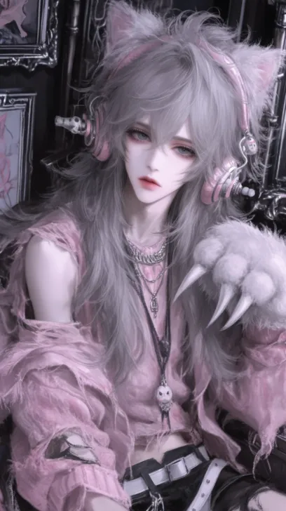 Midjourney Bot 更新时间:2026-02-05 00:07盐系男美人,超绝眼睛特写镜头,高级cg,超高清画质,磨砂质地细腻白皙皮肤,细腻,写实,油画感,眼神勾人,可爱,病娇,慵懒感,近距离,面部特写,眼部特写,冷色调,暗黑风, 浅灰色蓬松凌乱微长发,淡灰色眼眸,狭长的眼睛,头戴粉色猫耳款耳机,粉色毛绒毛衣,褴褛感毛衣,双层项链,手戴粉色巨大的猫爪毛绒手套,粉色猫爪毛绒手套上带爪子,透明爪子,白色透明爪子抓的动作,爪尖长而锋利,招财猫动作,白色腰带 坐在粉色毛绒座椅上,二次元可爱系漫画墙 --ar 9:16 --c 14 --stylize 800 --niji 6 --profile 8qgxcwv --no Profile,侧脸,脸部特写,3D画风,现实画风,扭曲脸部,奇怪比例,非p值画风,人物畏手畏脚,人物模糊,害羞,可爱,萌妹子,萌,幼态脸,眼睛发光,仰头,大红厚嘴唇,水滴,丝带,绷带
