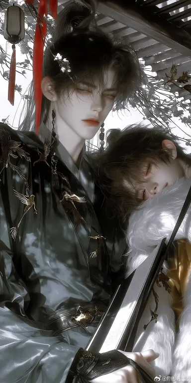 Midjourney Bot 更新时间:2026-02-05 00:08https://images.gogpt.vip/aigf/m_origin/20260118/2031159/ujaq6o8j51vyo0xm.jpg https://images.gogpt.vip/aigf/m_origin/20260119/2031159/j36xzkle6aqccifq.jpg https://images.gogpt.vip/aigf/m_origin/20260119/2031159/02svadl8pzolodv0.jpg https://images.gogpt.vip/aigf/m_origin/20260204/2031159/rs0g9d4t6yaf0ya5.jpg https://images.gogpt.vip/aigf/m_origin/20260118/2031159/wdnjb9wzrhkvsjsu.jpg https://images.gogpt.vip/aigf/m_origin/20260118/2031159/mynf1b4h2ggrosvn.PNG https://images.gogpt.vip/aigf/m_origin/20260118/2031159/afdcw8wf3pd0vo6r.jpg https://images.gogpt.vip/aigf/m_origin/20260118/2031159/z1s2lp8bro8xel54.jpg 是两位气质截然不同的古风人物。左侧的青年有着高束的墨黑长发,面容冷峻沉稳,眉眼低垂,神情里带着淡淡的疲惫与温柔,他身着深墨绿与烟灰色交织的宽袖长袍,衣身点缀着金色纸鹤纹样,领口露出浅灰内搭,腰间系着嵌玉革带,整体造型兼具江湖侠气与世家公子的矜贵感。他手持一卷书简,闲适地倚坐在廊下,姿态松弛又带着守护的张力。 右侧的少年则枕着一团雪白的狐毛睡得安稳,浅棕的发丝散落,面容柔和恬静,身上的浅黄内衬与墨绿外袍和青年的服饰相呼应,衣摆处同样点缀着金色纸鹤。 背景是雅致的中式廊檐,垂挂着朱红缎带与白色灯笼,廊外的枝桠与飘落的花瓣在暖光中交织,营造出静谧又温柔的午后氛围,金色纸鹤在两人周身翻飞,为画面增添了一丝灵动的诗意。 生成的画面像漫画风格分成两部分。第1个少年在上面,第2个少年在下面 小畑刚,写实动漫风格,xxxHolic, --ar 1:2 --stylize 100 --iw 1.5 --niji 7 --sref https://images.gogpt.vip/aigf/m_origin/20260118/2031159/z1s2lp8bro8xel54.jpg https://images.gogpt.vip/aigf/m_origin/20260118/2031159/afdcw8wf3pd0vo6r.jpg https://images.gogpt.vip/aigf/m_origin/20260118/2031159/mynf1b4h2ggrosvn.PNG https://images.gogpt.vip/aigf/m_origin/20260118/2031159/wdnjb9wzrhkvsjsu.jpg https://images.gogpt.vip/aigf/m_origin/20260204/2031159/rs0g9d4t6yaf0ya5.jpg https://images.gogpt.vip/aigf/m_origin/20260119/2031159/02svadl8pzolodv0.jpg https://images.gogpt.vip/aigf/m_origin/20260119/2031159/j36xzkle6aqccifq.jpg https://images.gogpt.vip/aigf/m_origin/20260118/2031159/ujaq6o8j51vyo0xm.jpg --sw 592