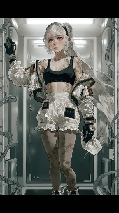 Midjourney Bot 更新时间:2026-02-04 00:14https://images.gogpt.vip/aigf/m_origin/20260204/2020962/la88xwrt230zvtgf.jpg 动漫插画,特写,清新治愈风格,参考左图图片中一位银发少女飞行员动作姿势形象和背景沟通,背景充满简洁的机械细节,柔和色彩,细腻的人物表情,参考右图色彩光影和质感(复古未来主义动漫风,采用厚涂笔触与细腻的色彩渐变,既有动漫的流畅线条和人物塑造,又有油画般的质感和色彩层次)。 --ar 9:16 --stylize 250 --iw 1.25 --niji 7 --no uniform ship design,identical size,bright background,cartoonish,low resolution,blurry