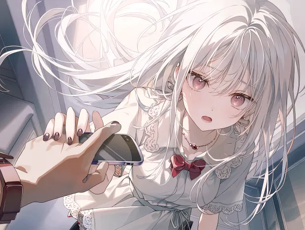 Midjourney Bot 更新时间:2026-02-04 00:15日式二次元插画风格。 特写视角,一只涂着指甲油的女性手,突然从(一位16岁漂亮女孩,银白色长直发蓬松飘逸,浅粉色眼睛,瞳孔含高光,穿着白色衬衫,袖口带有荷叶边设计,戴着红色蝴蝶结,脖子上戴着精致的项链,白色百褶裙,黑色鞋子)的手中抽走手机,女孩表情惊讶,客厅,室内,动作瞬间 。日式二次元插画风格,细腻的手绘笔触,柔和的冷暖色调对比,通透的画面质感,整体氛围兼具叙事感与细腻的情绪表达。通透的画面质感,细节丰富,能清晰展现服饰纹理。 --ar 4:3 --stylize 100 --niji 7