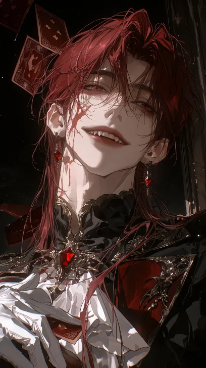 Midjourney Bot 更新时间:2026-02-04 00:21男人,深红色飘柔蓬松长发,两颗尖牙,柔光,眉眼狭长立体,五官深邃精致,水润唇,瞳孔为浅红色,冷血动物竖瞳孔,吸血鬼,危险感,画面精致美观,唯美感,身穿高定黑色礼服身上有红宝石富有设计感装饰领口处有白色叠层布料装饰,背景为黑色富有设计感黑色城堡内部,身后有着从天而降散落的红色扑克牌,意境感,站在城堡窗口处,城堡里环境昏暗,戴白色手套单手抱胸,一只手拿着扑克牌,红色瞳孔微微发光,bjd质感,超高清画质,唯美画风,柔和感,写实感,高级cg,俯视角度,脸部有细节描写,放大特写,怼脸拍, --ar 9:16 --stylize 764 --niji 7