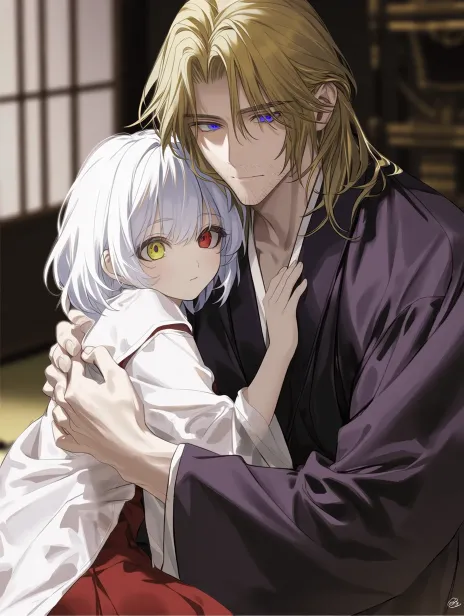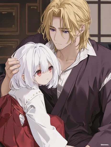 Midjourney Bot 更新时间:2026-02-04 00:36https://images.gogpt.vip/aigf/m_origin/20260204/2048949/dhfp5ojl77og0ozw.jpg 帮我生成图片:一个白色短发,左眼金色,右眼红色的萝莉体型少女趴在一个金色短发,梳着背头,紫眸的男子怀里。男子手摸着少女的后脑勺。男子穿着暗紫色的和服,气质成熟,没有胡须。少女穿着红色裙子,衣衫半褪。背景是和风的房间内。参考这张图的像素艺术风格,男子的胡须不要。 --ar 3:4 --stylize 100 --iw 0.25 --niji 7