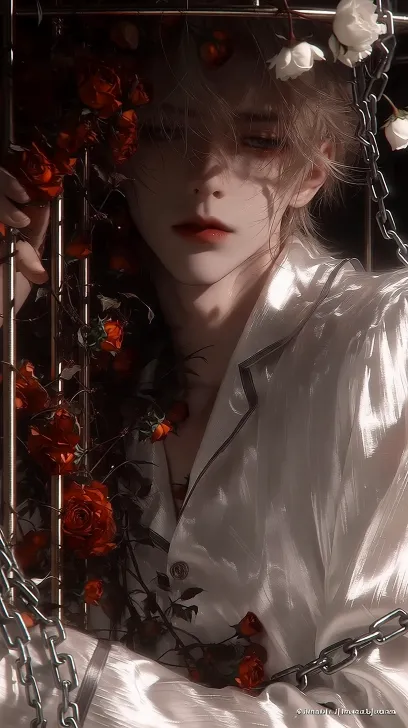 Midjourney Bot 更新时间:2026-02-04 00:23一个男性纤细少年,上半身特写,近景,他身穿白色丝绸睡衣,有灰色边,在爬满带刺红玫瑰藤蔓的黄金笼中瘫坐,双手抓笼杆,表情忧郁,看镜头超清晰面部,他白色长发柔顺,根根分明,睫毛纤长根根分明,表情忧郁,场景中灰白雾气浓密,地上散落大量枯萎玫瑰花朵,空中飘着较多白玫瑰花朵,周围缠绕银黑锁链,整体氛围昏暗诡异,丁达尔效应明显,优化色彩层次,自然光线,质感十足,摄影风格,比例9:16。半厚涂画风,cg感觉。 --ar 9:16 --c 17 --weird 187 --stylize 764 --niji 7 --sref https://images.gogpt.vip/aigf/m_origin/20260204/2034231/k0vb071am1di7aij.jpg --sw 1000 --no 低分辨率