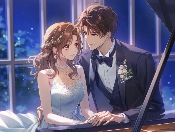 Midjourney Bot 更新时间:2026-02-04 00:23年轻美丽的女孩和男孩坐在钢琴架前,女生深情款款地看着男生,女生的手指在灵活的弹琴。背景是落地窗,窗外有繁华的夜景。男生在女生后面拉着小提琴,男生女生都长得非常优雅 --ar 4:3 --stylize 100 --niji 7