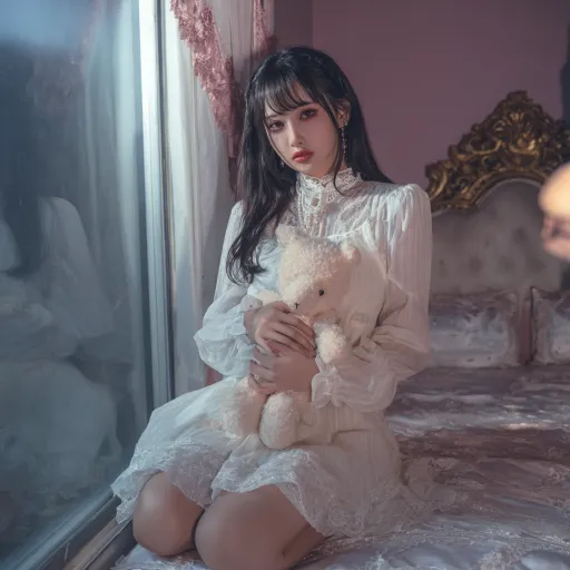 Midjourney Bot 更新时间:2026-02-04 00:32真人少女在落地窗前坐着,痴痴地看着。身穿白色得体的纱裙,抱着一个巨大的洋娃,房间很华丽 背后有一个男人的背影,男人很帅 --ar 1:1 --v 7 --stylize 100