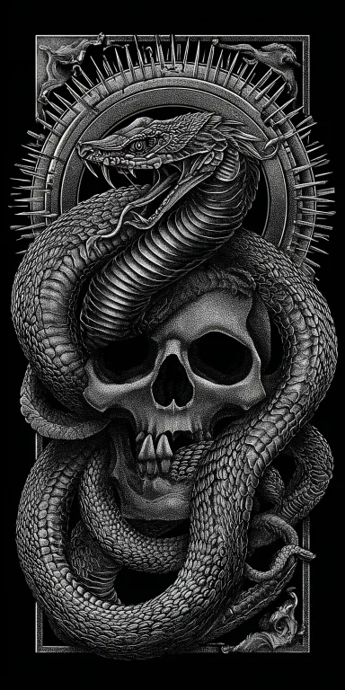 Midjourney Bot 更新时间:2026-02-04 00:35暗黑风格纹身手稿 蛇和骷髅 恐怖 黑白色 扭曲 变异恐怖 --ar 1:2 --v 7 --stylize 100