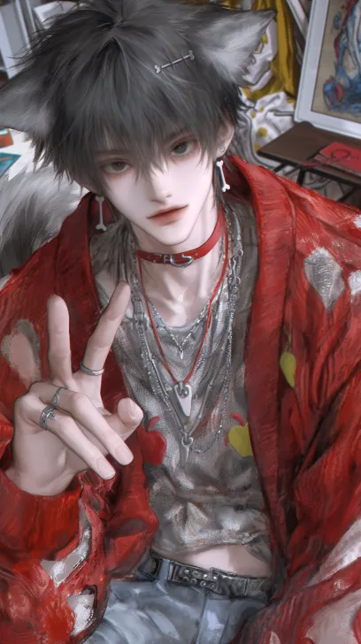 Midjourney Bot 更新时间:2026-02-02 00:15少年感,一个帅气的18岁东亚男孩,黑色头发,狼尾发型,刘海遮盖额头,有一双漂亮的黑色眼睛,看镜头,眼睛特写,垂耳小狗耳朵 ,戴着骨头形状的塑料发卡,一件宽松的渔网镂空内搭,红色开衫外套,外套有苹果装饰,面料柔软垂坠感好,红色皮质项圈,叠戴项链,戒指,耳钉,帅哥,可爱,阳光,明亮的环境,低饱和的冷色调,对着镜头比剪刀手,戒指,耳朵,叠戴项链,朋克,房间,沙发,书桌,数字绘画,伪厚涂,画面柔美,发丝细节,8k画质,色彩整洁,笔触细腻,背景丰富, 镜头从上往下拍,半身特写,光影细节 --ar 9:16 --style raw --stylize 588 --niji 6 --profile m212hx7 rxmwu6l wnl732b --no 纹身,女生,女性,娃娃脸,鼻钉,长发,妖艳,挑染,美丽,阴暗,鼻钉,仰头,水,眼泪,汗水