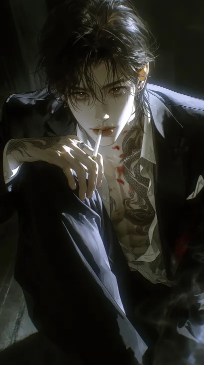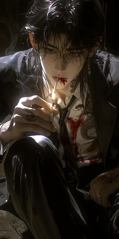 Midjourney Bot 更新时间:2026-02-02 00:22从上向下拍,杰作,最佳画质,细腻渲染,((半身像,脸上和身上带着点红色颜料)),8k分辨率,高级CG,2.5D半写实伪厚涂,写真度40%。2.5D动画风格,高清面部,五官帅气成熟的年轻成熟男性,黑色头发,发尾很长,碎刘海,翠黑色瞳孔,长睫毛,皮肤小麦色,面无表情正在叼着烟,一只手用打火机点烟,火苗的光柔和的搭在坚毅的脸上,不看镜头,身材健壮,从锁骨肩膀到侧腰有一条蜿蜒的巨蟒纹身,白色衬衫黑色西装,黑色西裤,衣服质感高级,衣服上有一些红色颜料,身材健壮,居中构图,坐在地上,支起一条腿,一条胳膊搭在支起的膝盖上,昏暗小巷子背景,微弱的灯光打在人物身上,电影级光影,高级质感,暗色调,高饱和度,细节修复,光线追踪(叼着烟) --ar 1:2 --stylize 1000 --niji 7 --no 短发,胡子,微笑
