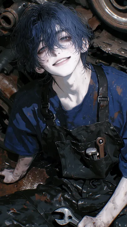 Midjourney Bot 更新时间:2026-02-02 00:19修车工,美少年,蓝黑色凌乱短发,露出额头,东方人,狭长眼,睫毛根根分明,水润唇,表情很凶,痞帅,嘲讽笑。 • 内搭做旧炭蓝黑色圆领T恤, • 外穿黑色工业围裙,有口袋,口袋里露出工具,(扳手,钳子),围裙上有少量深褐色油污与金属划痕,他蹲在地上,手里拿着一个扳手,抬眼看镜头,桀骜不驯 镜头:俯拍视角,上半身近景,浅景深,背景虚化,前景虚化 背景:修车厂,堆满生锈零件、旧轮胎与油污地面,工业风细节,半厚涂漫画风格,高对比度,暗黑颓废氛围,细腻皮肤质感 ,BJD,高级CG,清晰感,8k高清,水润感,面部特写,线条流畅,三分法构图,复杂纹理,极致细节。比例 9:16。 --ar 9:16 --c 17 --weird 187 --stylize 876 --niji 7 --no 低分辨率