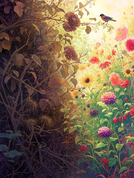 Midjourney Bot 更新时间:2026-02-02 00:26主体内容:画面左侧呈现凋零枯萎的花卉,包含干枯的玫瑰、褐色虞美人、凋谢的雏菊、带刺的蓟类;右侧是盛放的繁茂花丛,包含大朵百合、明艳向日葵、温柔鸢尾、细碎满天星和红色浆果,一只小鸟停在右侧花枝上 场景设定:静谧的郊外野地,柔和的阳光穿透花丛,微风轻拂带来自然的呼吸感 风格参考:印象派油画,融合写实主义细节与浪漫主义梦幻感,治愈系插画风格,童话绘本质感。 色彩色调:高饱和度、高通透感的缤纷色彩。左侧营造干枯萧瑟的质感,右侧呈现饱满鲜活的通透感。左侧以深褐、暗黄、灰紫为主的暗沉干枯色调;右侧以嫩绿、明黄、暖橙、绯红、粉紫为主的鲜亮饱满色调,整体形成强烈的冷暖明暗对比。过渡自然。 构图视角:水平全景式构图,左右分区明确,中间过渡自然,植物从底部向上自然生长, 附加细节:左侧突出干枯的枝干、卷曲的残叶、褪色的花瓣;右侧展现半透明的叶片纹理、饱满的花瓣层次、微妙的色彩渐变,以及小鸟带来的灵动生机 --ar 3:4 --niji 7