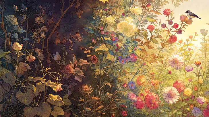 Midjourney Bot 更新时间:2026-02-02 00:27主体内容:画面左侧呈现凋零枯萎的花卉,包含干枯的玫瑰、褐色虞美人、凋谢的雏菊、带刺的蓟类;右侧是盛放的繁茂花丛,包含大朵百合、明艳向日葵、温柔鸢尾、细碎满天星和红色浆果,一只小鸟停在右侧花枝上 场景设定:静谧的郊外野地,柔和的阳光穿透花丛,微风轻拂带来自然的呼吸感 风格参考:印象派油画,融合写实主义细节与浪漫主义梦幻感,治愈系插画风格,童话绘本质感。 色彩色调:高饱和度、高通透感的缤纷色彩。左侧营造干枯萧瑟的质感,右侧呈现饱满鲜活的通透感。左侧以深褐、暗黄、灰紫为主的暗沉干枯色调;右侧以嫩绿、明黄、暖橙、绯红、粉紫为主的鲜亮饱满色调,整体形成强烈的冷暖明暗对比。过渡自然。 构图视角:水平全景式构图,左右分区明确,中间过渡自然,植物从底部向上自然生长, 附加细节:左侧突出干枯的枝干、卷曲的残叶、褪色的花瓣;右侧展现半透明的叶片纹理、饱满的花瓣层次、微妙的色彩渐变,以及小鸟带来的灵动生机 --ar 16:9 --niji 7