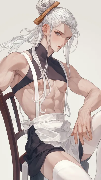 Midjourney Bot 更新时间:2026-02-02 00:29厚涂插画,绝美动漫插图,一个俊美动漫男人,白色长发白、螺旋型发髻、木簪,穿着围裙,白色长筒袜,双腿细长,肌肉线条流畅,坐在椅子上 --ar 9:16 --style raw --stylize 180 --niji 6 --no no