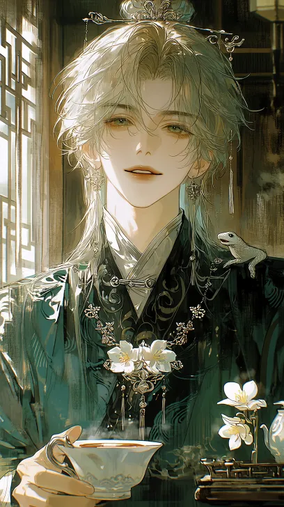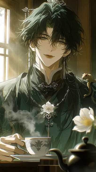 Midjourney Bot 更新时间:2026-02-02 00:29一个古风男生,脸部重点,邪魅,惊艳脸部特写,电影质感,故事感,氛围感,镜头焦点,全身图,散漫,手臂上有一只蜥蜴,背景虚化,俯拍镜头,表情安静,色彩线条有漫画质感,中国水墨风和现代漫画风格的唯美融合,脸部比例优越,镜头从胸膛到头部,绿色为主,一半明亮一半暗的光线,窗户有阳光透进来,背景为木质房间,精灵耳,豆沙色粉嘴唇,黑金色渐变眼睛,暗黄色眼影,绿色的头发,长发,唯美意境,穿的绿色中国长袍,头发有一根银制梨花钗子,肩背的肌肉线条透过布料凸出来,手里拿着茶杯,桌子上有茶壶,俊美阴暗的气质,24k分辨率,精细刻画,脖子上昂贵的白色梨花项链,有一朵白色花瓣黄色花蕊的梨花 --ar 9:16 --c 14 --weird 283 --stylize 1000 --niji 7