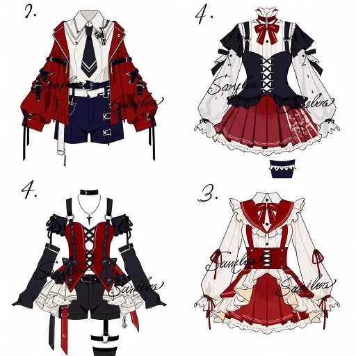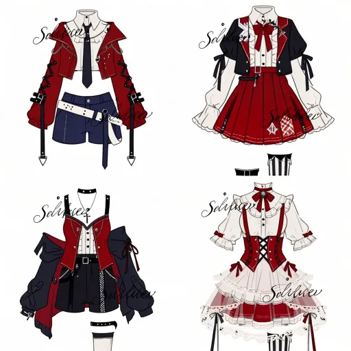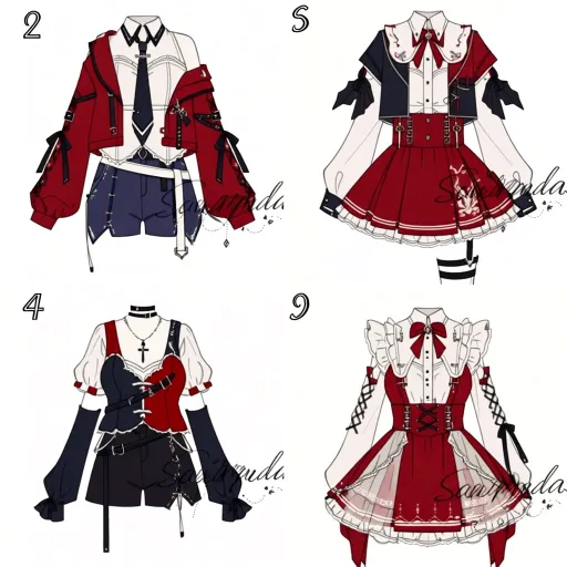 Midjourney Bot 更新时间:2026-02-02 00:30https://images.gogpt.vip/aigf/m_origin/20260201/1686785/keaezglwmazkxp43.jpg 1. 左上(学院机能风) - 整体风格:以红、黑、白为主色调,是学院风与机能感的混搭设计,兼具硬朗与柔和。 - 上衣设计:外层是红色短款宽松外套,袖口与领口处装饰黑色绑带和金属扣,强化机能属性;内搭是白色翻领衬衫,搭配黑色领带,领口叠加黑白装饰领带,层次丰富。 - 下装搭配:深蓝色短裤,腰间搭配白色宽腰带,整体造型利落,学院感十足。 2. 右上(甜酷洛丽塔风) - 整体风格:红、黑、白为主,融合洛丽塔的甜美与暗黑元素,风格独特。 - 上衣设计:外层是黑红拼接的短款马甲,马甲两侧装饰黑色布料,增添酷感;内搭是白色泡泡袖衬衫,领口系大红色蝴蝶结,甜酷感平衡得恰到好处。 - 下装搭配:红色百褶短裙,裙摆点缀白色图案,搭配黑白条纹裤袜,整体造型既甜美又带暗黑气质。 3. 左下(甜酷朋克风) - 整体风格:红、黑、白为主,是朋克风与甜系元素的融合,层次丰富且个性鲜明。 - 上衣设计:外层是红黑拼接撞色,表面装饰黑色绑带;内搭是白色泡泡袖衬衫,搭配黑色长袖套,颈部佩戴细链条项链与十字架吊坠,强化朋克属性。 - 下装搭配:黑色短裤,叠加白色蕾丝裙撑,腰间装饰黑色绑带,整体造型兼具甜美感与叛逆感。 4. 右下(甜系洛丽塔风) - 整体风格:以白、红为主色调,是典型的甜系洛丽塔设计,柔和甜美且细节精致。 - 裙装设计:挂脖式吊带版型,领口系红色蝴蝶结,裙身以白色为主,叠加多层蕾丝褶边,裙摆垂挂红色飘带与圆形小坠饰,增添灵动性。 - 整体造型蓬松柔美,充满少女感,适合软萌系角色设定。 --ar 1:1 --stylize 100 --iw 2 --niji 7