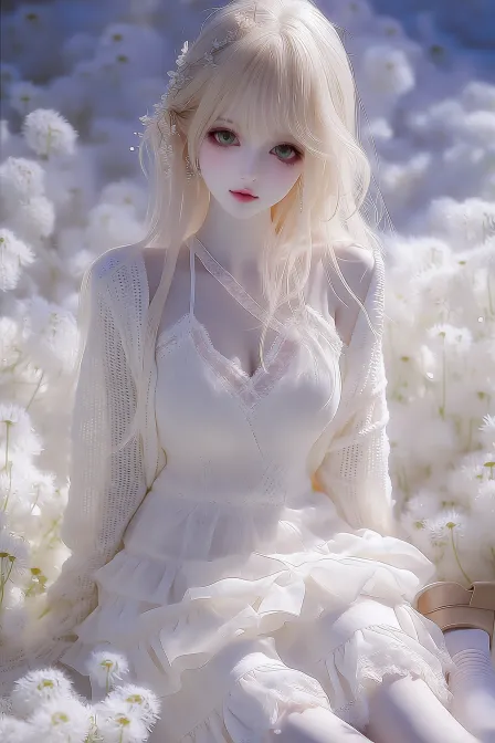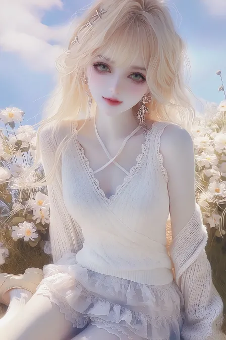 Midjourney Bot 更新时间:2026-02-02 00:31https://images.gogpt.vip/aigf/m_origin/20260201/2043228/wbo66xqsjmh4k33u.png 梦幻写实油画风格,Y2K美学,高端渲染,复古粉紫色调,柔和朦胧的光晕,柯达镜头纹理,航拍俯视视角。一位成年人类女性,身材高挑,鹅蛋脸,皮肤白晳,有着锐利野生的眉毛,绿色的瞳孔,哑光淡粉色嘴唇。她是一位甜美又带点俏皮,拥有黄色的及腰长发披散在胸前,带着蕾丝头饰,银色耳饰,上身穿着米白色交叉V领针织吊带,带蕾丝包边,修身版型凸显曲线,下身双层荷叶边蛋糕裙裤,外层压褶雪纺,宽松垂坠感针织开衫、落肩版型,在夏季蓝色的天,身边堆满花朵,白色的云的公园的草地上坐着,穿着小腿袜套,和米色小皮鞋,脸上带着甜美的慵懒微笑,眼睛微微眯起来。整个场景笼罩在柔和的朦胧光晕中;柯达镜头增强了暖色调的饱和度,油画纹理柔化了杂乱的细节,营造出甜美、俏皮又慵懒的氛围。 --ar 2:3 --iw 0.25 --niji 7 --sref https://images.gogpt.vip/aigf/m_origin/20260201/2043228/wbo66xqsjmh4k33u.png --no 兔耳朵 猫耳朵 任何动物特征
