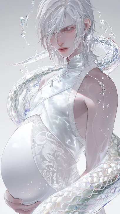 Midjourney Bot 更新时间:2026-02-02 00:31一个俊美动漫男人,怀孕,冷白皮古代神话,插画,美丽,绝美,半蛇妖男人,上半身人身,下半身巨大蛇尾,水珠,人身蛇尾,尾琉璃鳞片,湿漉漉的头发,穿着白色挂脖式旗袍,白色蕾丝花边,清晰8K,垫肩,肌肉线条流畅,站着, --ar 9:16 --style raw --stylize 180 --niji 6 --no no