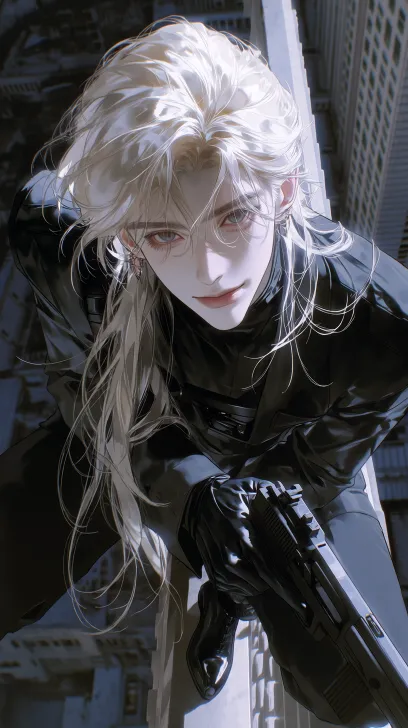 Midjourney Bot 更新时间:2026-02-02 00:34男人,白色高马尾,头发顺滑,蓬松,碎发挡眼,浅红色瞳孔,莹光,黑色露半指手套,黑色束身特工贴身高领衣服,单手拿枪,将枪放在下面,眉眼清冷,疏离感,清冷感,精致感,疯批感,病娇感,微风吹起发丝,微低头,俯视角度,高楼顶端,脚踩楼顶楼墙边上,画面寂静,周围楼低灯火通明,超高清画质,bjd质感,精美画质,精美画面, --ar 9:16 --stylize 764 --niji 7