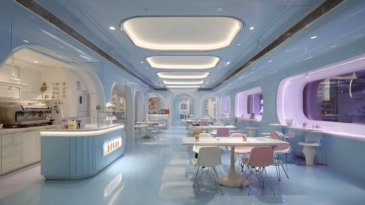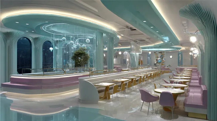 Midjourney Bot 更新时间:2026-02-03 00:02梦核美学餐厅。模仿电影大师雅克塔蒂风格,模仿电影《神奇四侠》。太空时代科幻氛围。青色烟雨主题,超大长条形室内空间,模块化餐区,服务台,自助窗口,模块化造型柱子五行元素,五行元素区域,童趣卡座。造型吊顶,发光灯膜。白色为主,淡蓝紫色配色,淡粉色配色,瓷砖,亮面,银质 --ar 16:9 --v 7 --style raw --stylize 100