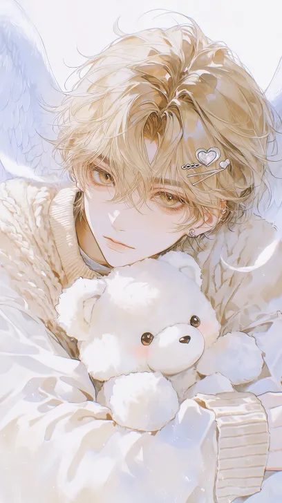 Midjourney Bot 更新时间:2026-02-01 00:29佳作,极品,超细节,1boy,美少年,清冷白皙的皮肤,正太,精致可爱的五官,清冷忧郁的气质,妖娆的冯丹眼睛,深邃的金色瞳孔,凌乱的金色短发,头发上的银色心形发夹,穿着柔软蓬松的米白色圆领毛衣,慵懒地躺着,双臂抱着一只白色毛绒小熊玩偶,身后有着天使的翅膀,动漫浓浓的画风,柔和的蓝白冷色调 细腻的笔触,透明的光影,强烈的氛围,带有颗粒感的水彩纹理,柔焦,景深浅,背景干净,细节高,8k --ar 9:16 --stylize 341 --niji 7