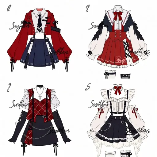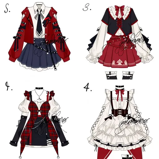 Midjourney Bot 更新时间:2026-02-02 00:01https://images.gogpt.vip/aigf/m_origin/20260201/1686785/keaezglwmazkxp43.jpg 1. 左上(学院机能风) - 整体风格:以红、黑、白为主色调,是学院风与机能感的混搭设计,兼具硬朗与柔和。 - 上衣设计:外层是红色短款宽松外套,袖口与领口处装饰黑色绑带和金属扣,强化机能属性;内搭是白色翻领衬衫,搭配黑色领带,领口叠加黑白装饰领带,层次丰富。 - 下装搭配:深蓝色百褶短裙,腰间搭配白色宽腰带,整体造型利落,学院感十足。 2. 右上(甜酷洛丽塔风) - 整体风格:红、黑、白为主,融合洛丽塔的甜美与暗黑元素,风格独特。 - 上衣设计:外层是黑红拼接的短款马甲,马甲两侧装饰黑色布料,增添酷感;内搭是白色泡泡袖衬衫,领口系大红色蝴蝶结,甜酷感平衡得恰到好处。 - 下装搭配:红色百褶短裙,裙摆点缀白色图案,搭配黑白条纹裤袜,整体造型既甜美又带暗黑气质。 3. 左下(甜酷朋克风) - 整体风格:红、黑、白为主,是朋克风与甜系元素的融合,层次丰富且个性鲜明。 - 上衣设计:外层是红黑格纹,表面装饰黑色绑带;内搭是白色泡泡袖衬衫,搭配黑色长袖套,颈部佩戴细链条项链与十字架吊坠,强化朋克属性。 - 下装搭配:黑色短裙叠加白色蕾丝裙撑,腰间装饰黑色绑带,整体造型兼具甜美感与叛逆感。 4. 右下(甜系洛丽塔风) - 整体风格:以白、红为主色调,是典型的甜系洛丽塔设计,柔和甜美且细节精致。 - 裙装设计:挂脖式吊带版型,领口系红色蝴蝶结,裙身以白色为主,叠加多层蕾丝褶边,裙摆垂挂红色飘带与圆形小坠饰,增添灵动性。 - 整体造型蓬松柔美,充满少女感,适合软萌系角色设定。 --ar 1:1 --stylize 100 --iw 2 --niji 7