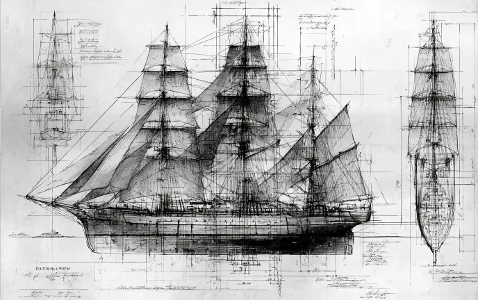 Midjourney Bot 更新时间:2026-02-02 00:03生成帕萨特号(Passat)帆船的复古手绘结构图,要求多角度,多细节,船体结构图,手绘风格,最中间主图船头朝左,tu's同一张图上需要有正视图,俯视图,和侧视图,要有英文的这艘船的名字 以下是这搜船的资料: 1911年,它在德国汉堡被建造 在第一次世界大战前 帕萨特号主要往返于南美洲与德国之间 作为运输船执行硝石运输任务第一次世界大战爆发后,帕萨特号被迫停航 并在战后被转让给了意大利 1975年,帕萨特号在退役后被卖给了纽约 几经辗转后,成为南街码头博物馆的一部分 成为了一个历史性地标,供公众参观 帕萨特号的历史见证了20世纪初的航运业发展 德国航运业的辉煌时期 以及两次世界大战对航运业的深远影响 16K质量,超高清, --ar 80:50 --v 7 --style raw --stylize 100 --sref https://images.gogpt.vip/aigf/m_origin/20260201/2026774/jh08g4du9fta7thj.jpg --sv 3
