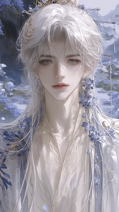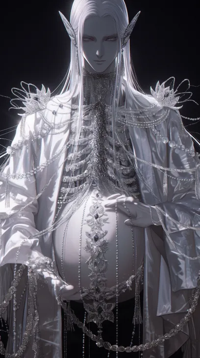 Midjourney Bot 更新时间:2026-02-02 00:05杰作, 顶级品质, 半写实, 电影般的插画,,动漫,清晰,复杂细节,最好的质量,超精细,高细节pixiv插画,画面8K清晰,暗色调,冷色调,天野喜孝风格。一个俊美动漫男人,蜘蛛亮片身体链,胸口骨头带有钻石,tassel肩带链,耳鳍,怀孕,白色长直发,长发柔 顺,冷白皮,珍珠缎面印花制式白色衬衫oversized, 拿着剑,缠枝莲纹印花,(((Gothic gloomy)))iridescence,钻石()水晶、流苏、亮片级联,冷白皮,动漫风格,串珠链叠戴,流光溢彩,细节,璀璨晶莹,holy light,数字艺术,,柔和调色板,动漫插图,柔和冷光 --ar 9:16 --style raw --stylize 180 --niji 6 --no no