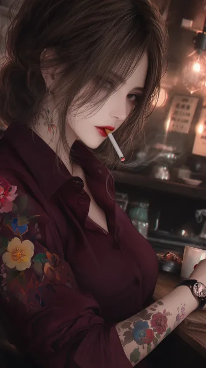 Midjourney Bot 更新时间:2026-02-02 00:05棕色头发,低盘发,美女,棕色眼睛,成熟女人,穿着酒红色衬衫,袖子撸上去,露出左手胳膊彩色花臂,丰满的胸脯,红色指甲油,拿着一只女士香烟,背景是香港冰室。 --ar 9:16 --style raw --stylize 250 --niji 6 --profile enrcvog --no raise one's head