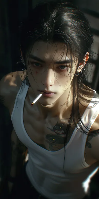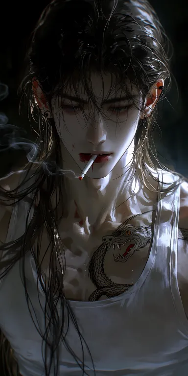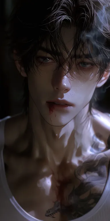 Midjourney Bot 更新时间:2026-02-02 00:05从上向下拍,杰作,最佳画质,细腻渲染,精致眼眸,((面部特写,脸上带着点红色颜料)),8k分辨率,高级CG,2.5D半写实伪厚涂,写真度40%。2.5D动画风格,高清面部,五官精致俊美的年轻成熟男性,黑色头发,发尾很长,碎刘海,翠黑色瞳孔,长睫毛,皮肤小麦色,面无表情抽烟看向镜头,身材健壮,从锁骨肩膀到侧腰有一条蜿蜒的巨蟒纹身,白色紧身背心,衣服质感高级,居中构图,昏暗小巷子背景,微弱的灯光打在人物身上,电影级光影,高级质感,暗色调,高饱和度,细节修复,光线追踪(叼着烟) --ar 1:2 --stylize 219 --niji 7 --no 短发,胡子,微笑