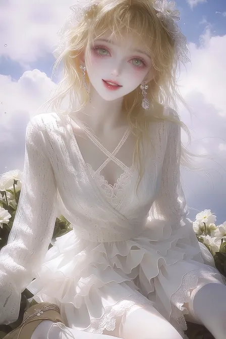 Midjourney Bot 更新时间:2026-02-02 00:08https://images.gogpt.vip/aigf/m_origin/20260201/2043228/qsppyiqbz2q6r4o4.webp https://images.gogpt.vip/aigf/m_origin/20260201/2043228/6q6admhkv31r8wso.png 梦幻写实油画风格,Y2K美学,高端渲染,复古粉紫色调,柔和朦胧的光晕,柯达镜头纹理,航拍俯视视角。一位成年人类女性,身材高挑,鹅蛋脸,皮肤白晳,有着锐利野生的眉毛,绿色的瞳孔,哑光淡粉色嘴唇。她是一位甜美又带点俏皮,拥有黄色的及腰长发披散在胸前,带着蕾丝头饰,银色耳饰,上身穿着米白色交叉V领针织吊带,带蕾丝包边,修身版型凸显曲线,下身双层荷叶边蛋糕裙裤,外层压褶雪纺,宽松垂坠感针织开衫、落肩版型,在夏季蓝色的天,身边堆满花朵,白色的云的公园的草地上坐着,穿着小腿袜套,和米色小皮鞋,脸上带着甜美的慵懒微笑,眼睛微微眯起来。整个场景笼罩在柔和的朦胧光晕中;柯达镜头增强了暖色调的饱和度,油画纹理柔化了杂乱的细节,营造出甜美、俏皮又慵懒的氛围。 --ar 2:3 --iw 0.25 --niji 7 --sref https://images.gogpt.vip/aigf/m_origin/20260201/2043228/wbo66xqsjmh4k33u.png https://images.gogpt.vip/aigf/m_origin/20260201/2043228/b293pa5z21vtw45f.png --no 兔耳朵 猫耳朵 任何动物特征