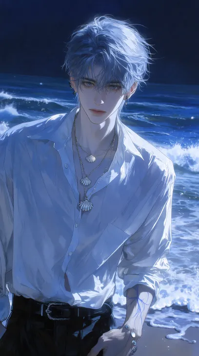 Midjourney Bot 更新时间:2026-02-02 00:1132k,电影光影,广角镜头,鱼眼镜头,远景,强烈对比,冷色调光影,半厚绘画风格,油画质感,清晰画面。韩国帅哥,蓝发,穿着时尚白衬衫,下半身黑裤,系着贝壳项链,银链,时尚,年轻感,脸冷,姿态酷炫,发型,天真皱眉,可怜,单眼皮,嘴下有指甲,眉骨状指甲,瓜子脸,长睫毛,皮肤细腻白皙,棕灰色瞳孔,高鼻梁, 远距离,手上的蓝色静脉。丰富的背景,户外场景:夜晚海滩、港口、夜景海景、动态姿势、海洋、珊瑚礁、星空、全肩、全身、大场景、大腿以上、大场景、风中飘扬的头发。 --ar 9:16 --c 21 --stylize 774 --niji 7