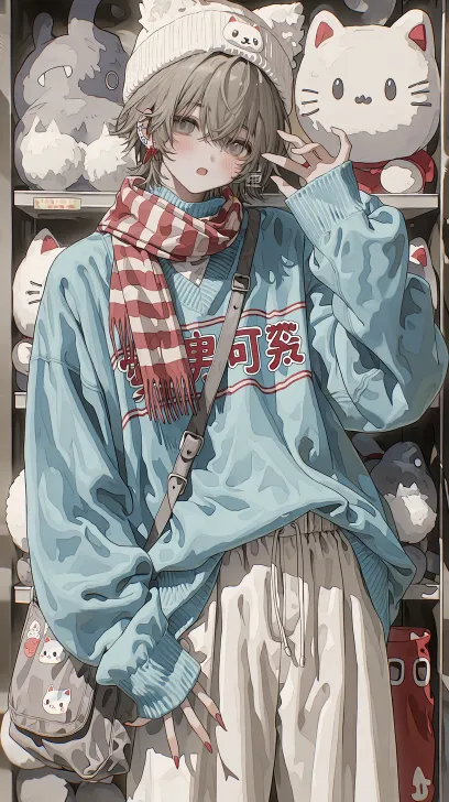 Midjourney Bot 更新时间:2026-02-02 00:12一位英俊的大学生,留着米色狼尾发型,发根竖起,头发蓬松,额头上长得恰到好处的刘海,散发出浓烈的青春气息。上半身是一件浅蓝色的水手领毛衣,领口系着红白条纹围巾。服装主体装饰有红线和卡通小图案。下摆是白色多口袋宽腿工作裤,斜挂着一个灰色毛绒玩具袋。整体风格是甜美又酷炫的“宅男可爱”混合氛围。柔软可爱的绒面材质与坚韧的工作裤形成鲜明对比,红蓝配色则增添了一抹日式活力。她头戴一顶白色遮耳帽(绣有刺绣)。她的毛衣领子上别着一个卡通卡通猫徽章。她的五根手指弯曲成猫爪的形状。一只手举到脸侧,另一只自然垂在身侧,呼应着猫耳发饰的可爱造型。背景是一个角落,堆满了灰白色的毛绒娃娃(如猫和鲸鱼娃娃)。这是一个中景,半长镜头,平视视角。它采用CG插画风格,BJD风格,多巴胺饱和,独特风格,强烈对比和清晰的焦点。 --ar 9:16 --c 21 --stylize 774 --niji 7