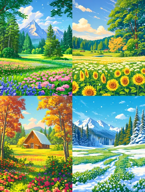 Midjourney Bot 更新时间:2026-02-02 00:12主体内容:四格拼接插画,分别描绘春(森林花田)、夏(向日葵花田)、秋(森林木屋)、冬(雪山湖泊)的自然风景 场景设定:营造诗意治愈的氛围。 风格参考:印象派油画,融合写实主义细节与浪漫主义梦幻感,治愈系插画风格,童话绘本质感。 色彩色调:四格分别采用对应季节的色调:春(嫩绿色调)、夏(明黄暖调),秋(暖橙色调)、冬(蓝白冷调)高饱和度、高通透感的缤纷色彩,冷暖对比鲜明。 构图视角:四格上下拼接构图,每格为平视视角,风景为主,布局平衡有节奏感,每格边缘做撕页效果 --ar 3:4 --niji 7
