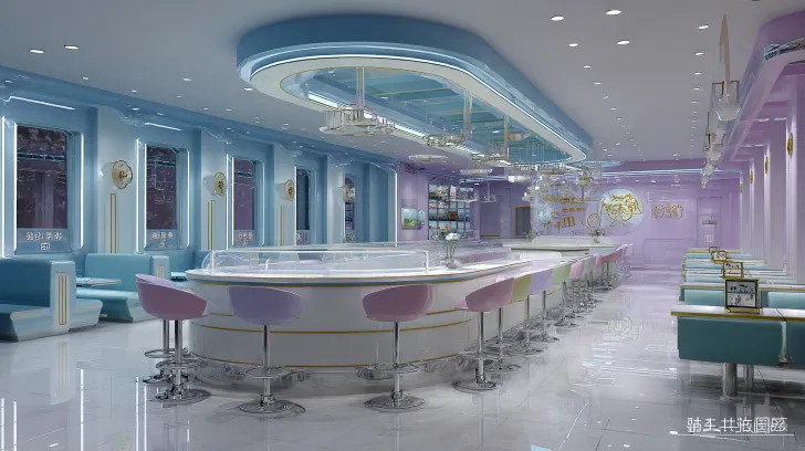 Midjourney Bot 更新时间:2026-02-02 00:14中式奇幻美学餐厅。模仿电影大师侯麦风格,模仿电影《合成人》。 孟菲斯风格,太空时代科幻氛围。超大长条形室内空间,模块化餐区,服务台,自助窗口,模块化造型柱子五行元素,五行元素钟表模块化二十四节气元素区域,符号学。造型吊顶,发光灯膜。白色为主,淡蓝紫色配色,淡粉色配色,瓷砖,亮面,银质 --ar 16:9 --v 7 --style raw --stylize 100