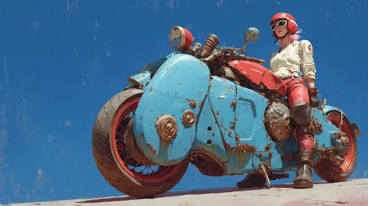 Midjourney Bot 更新时间:2026-01-30 00:141全景(极低仰拍)风格类型: 数字油画,莫比乌斯艺术风格,复古未来主义风格,极繁主义风格。 色彩和光影方案: 高饱和纯蓝天空背景,强烈的侧逆光和刀锋状硬阴影,高对比色彩,肌肤柔光与机甲硬阴影冷暖对冲。镜头设计要求,极低摄影位置,向上仰拍女骑手的角度。细节特征: 人物或者动物和其他主体,画面层次丰富、装饰性强,机甲以莫比乌斯螺旋为核心纹,叠加微型齿轮/交错电路/复古雕花/做旧铆钉,纹路层层嵌套呈立体浮雕质感,疏密有致,科技套装破损处边缘毛边磨损自然,露出的皮肤质感细腻有通透感,摩托双层莫比乌斯管线发光呈淡紫色,管线衔接处有微型螺丝,飞船金属外壳有复古做旧氧化痕迹与划痕,能量屏障光影通透有粒子感,骑手脸部轮廓清晰锋利,眼神冷艳锐利,眼尾有金属饰片反光,兼具设计感、新奇感、独特感与梦幻感。电影级高品质画质,数字油画厚涂笔触,机甲金属质感冰冷坚硬,肌肤质感柔软细腻,光影层次极致丰富,莫比乌斯元素全画面呼应统一。 --ar 16:9 --v 7 --style raw --stylize 250 --no 任何文字,中文,英文,韩文,日文,任何字符