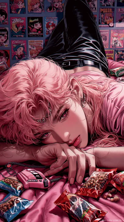 Midjourney Bot 更新时间:2026-01-30 00:17超精细半厚涂画风,一位粉色长发男孩,头发光泽柔顺感,精致眼睛,瞳孔绝美复杂,中间有粉色美瞳,小虎牙,冷脸,眼睛大而狭长,精致漂亮感粉色T恤配亮面黑色长裤,趴卧在粉缎面的床上,拿着一个粉色的旧电话,电话机,床上有各色包装的零食袋子,背景的墙纸上是80年代美国漫画海报,很多张,风格甜酷复古,色调粉紫暗调交织,中景侧视拍摄,细节显毛绒质感与物件复古感,氛围慵懒个性,卧室内景, --ar 9:16 --c 15 --weird 931 --stylize 764 --niji 7 --no 精灵耳朵,