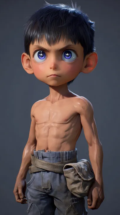 Midjourney Bot 更新时间:2026-01-30 00:21虚幻引擎5电影级渲染,3D动漫写实风格,PBR流程,次世代游戏概念美术。史诗级电影概念艺术,Unreal Engine 5渲染,3D动漫写实风格,PBR材质,一个六岁的亚洲男孩,身材比同龄人更匀称挺拔。面孔兼具孩童的圆润与超越年龄的沉静。3D动漫写实风格,电影级角色模型,超精细细节,皮肤次表面散射效果,眼神清澈而坚定。2. 外貌特征细化 发型: 标志性的黑色短发,前额有微分碎刘海,发丝根根分明,在光线照射下泛起深蓝色光泽(发丝反射光)。 眼眸: 大眼睛,瞳孔为深蓝色,在激动或使用紫极魔瞳时能转化为淡紫色,清澈晶莹,有星形高光。 其他: 五官精致,眉毛修长,表情通常平静,偶尔流露出属于成年人的深邃神情。 3. 服装与细节 衣着: 身穿圣魂村常见的粗布衣裤,款式简朴。布料有清晰的编织纹理和微小的磨损、补丁。颜色为灰蓝色系,洗得有些发白。 配饰: (可选)腰间挂着一个陈旧但结实的小布包,用于装捡来的铁矿石或小工具。 身体: 手掌和指关节略有薄茧,暗示经常干活。身材虽瘦但肌肉线条紧实,隐含力量感。虚幻引擎5渲染 皮肤的贴图和质感更细腻一点有点光泽,头发逼真一点。皮肤更像真人一样,脸型稍微圆润一点,嘴巴稍微带点口红浅浅的 。生成这个角色的三视图全身像。脸的下巴太尖了,稍微圆润一点.皮肤太油了,稍微降低一下 虚幻引擎5,景深, --ar 9:16 --stylize 100 --niji 7 --no 去掉水印