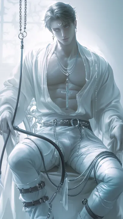 Midjourney Bot 更新时间:2026-01-30 00:23一个俊美美貌动漫男人,白色长袍,坐着椅子上,皮鞭、腹肌、锁骨、恐怖气氛、锁链、项圈、腿环、(((背带))),胸肌,浅色唇,(((Gothic gloomy)))iridescence,钻石()水晶、流苏、亮片级联,肌肉线条流畅,冷白皮,动漫风格,串珠链叠戴,流光溢彩,细节,璀璨晶莹,holy light,数字艺术,高角度拍摄,柔和调色板,动漫插图,柔和冷光,sketching,anime风格,热爱太阳的人"动画系列中的人偶,洛可可风格,宁静的海洋主题,水手月亮漫画风格,单色宁静,浅白和浅蓝色,空灵而超凡脱俗的氛围,日系漫画风格,耳坠,立体光,淡蓝色,构图完美,细腻流畅线条,lines完整 --ar 9:16 --style raw --stylize 180 --niji 6 --no no