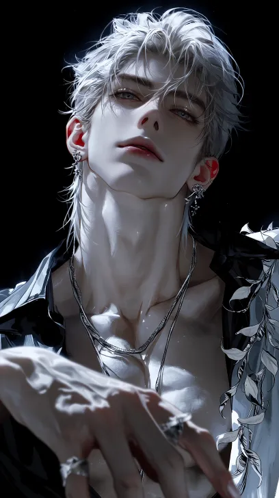 Midjourney Bot 更新时间:2026-01-30 00:26男子,飘逸蓬松头发 白金头发 哑光 耳朵佩戴银色小巧耳钉,带银色富有设计感项链,长相权威 骨相美 灰色眼睛,竖瞳,五官深邃,立体 眼神富有侵世感 疯批感,病娇感,冷漠感 权威感 暗黑 禁欲系 桀骜不驯感,痞帅感,眼神淡漠,权威脸,薄唇轻勾,没什么情绪起伏,放大肌肉线条 掌控感 动作:他身体微微后仰,一只手搭在腰侧,另一只手向前延伸引导镜头视角,配合仰拍角度营造出压迫感和力量感。 镜头:机位:采用低角度仰拍,配合人物前倾的手臂,形成视觉引导,让画面更具冲击力和沉浸感。 光线:使用红色氛围光打亮局部,制造明暗对比,突出肌肉轮廓和冷峻氛围,增强了画面的故事感。 禁欲系性感男仆装围裙,也被称为肌肉款cos围裙 黑底配白色荷叶边 颜色饱满,磨砂质感 脸部有着细节描写,水润唇,高级CG,伪厚涂插画,冷色调 --ar 9:16 --stylize 712 --niji 7
